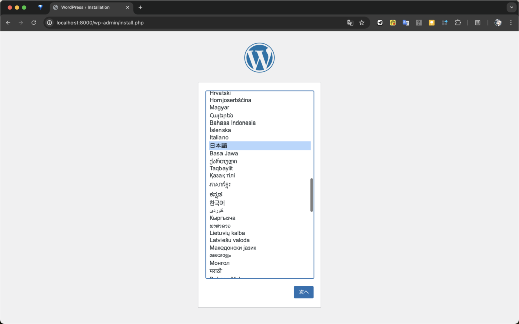 コンテナが正常に起動したら、ブラウザを開き、http://localhost:8000 にアクセスします。WordPressの初期セットアップ画面が表示されるはずです。画面に表示される指示に従ってのセットアップを完了することで、ローカル環境でWordPressの使用を開始することができます。